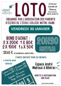 26 janvier LOTO 30 JANVIER 2026 ORGANISÉ PAR L’APEL ÉCOLE, COLLÈGE, ÉVÉNEMENTS, APEL, DIVERS Leave a comment